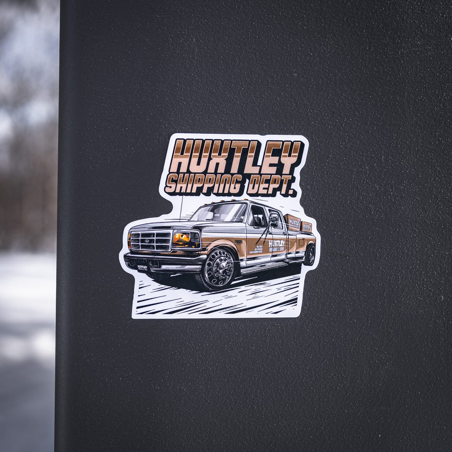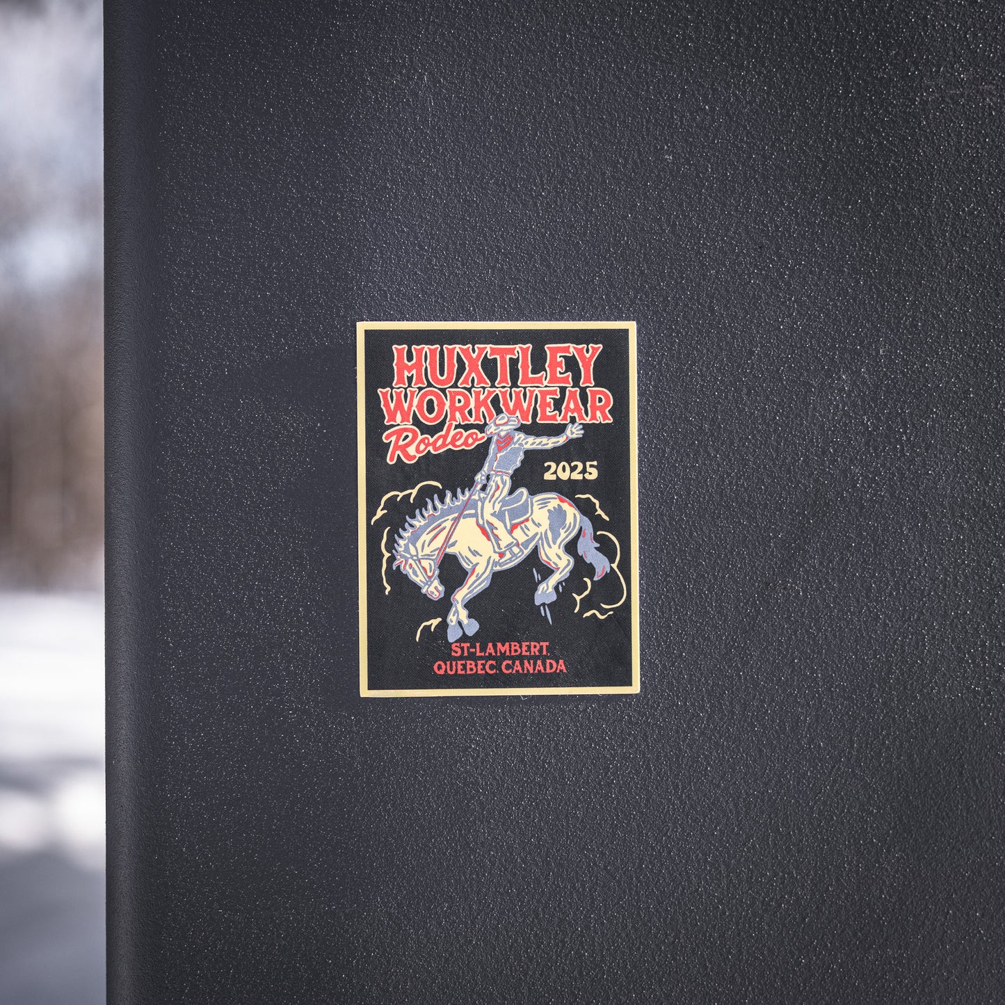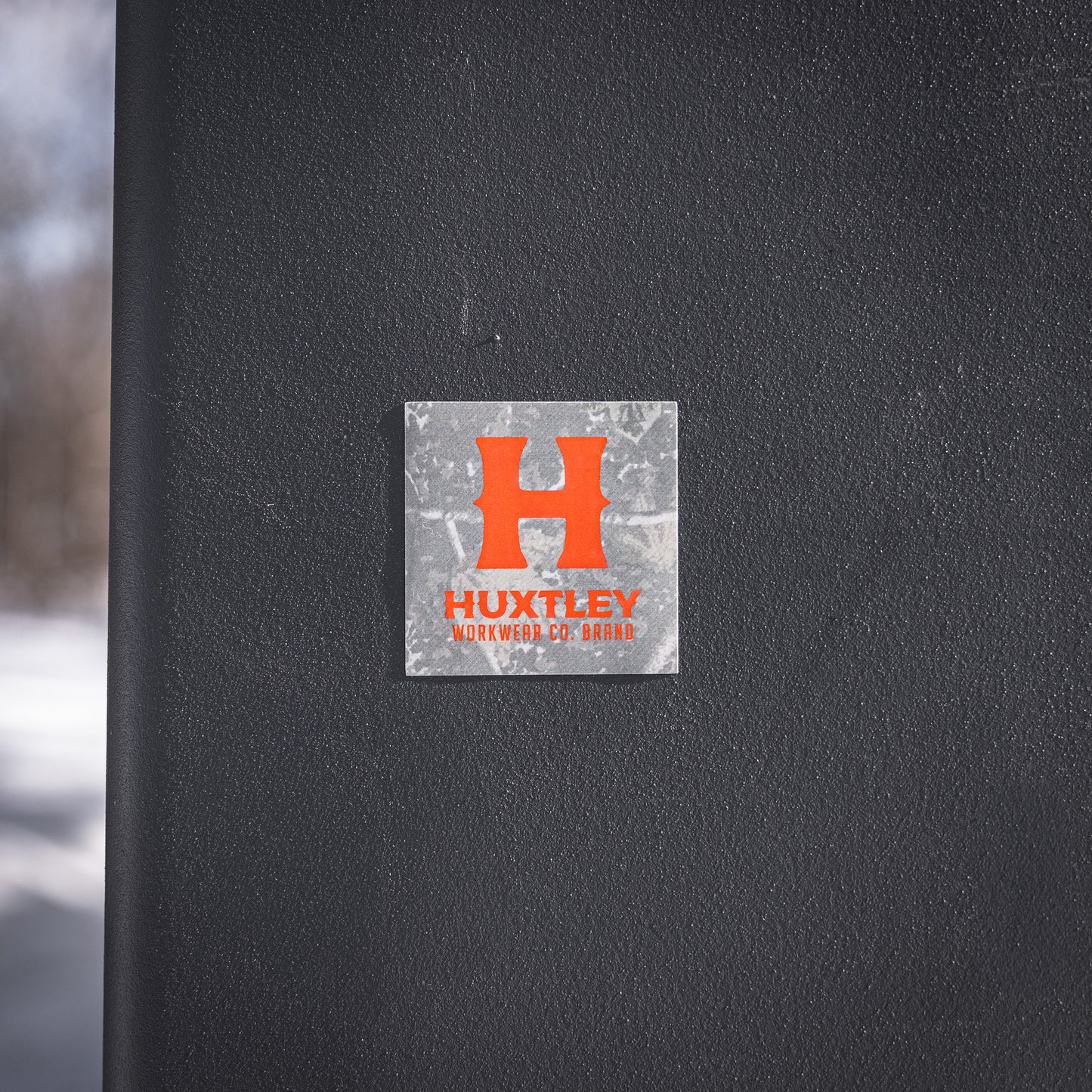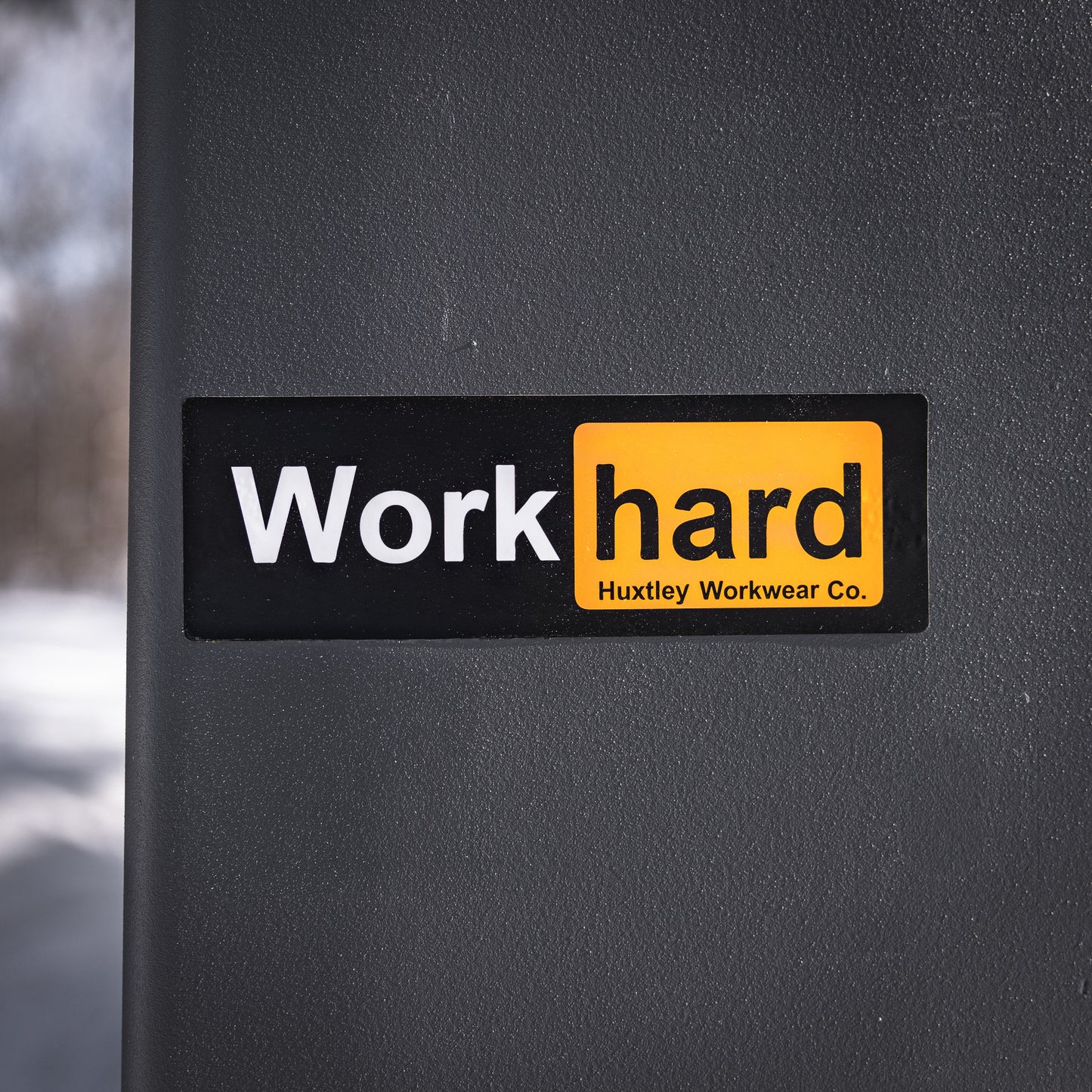 Représente Huxtley Workwear Co. en applicant des stickers partout!!
